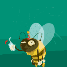 A cheerful animated bee wearing a party hat and holding a festive drink, celebrating its 'Buzzday'.