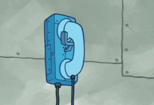 Patrick Star from Spongebob Squarepants answers a blue wall-mounted phone with a surprised expression.