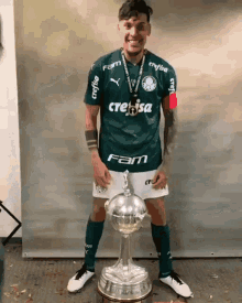 Gustavo Gomez celebrates his team's victory, posing triumphantly with the Copa Libertadores trophy.