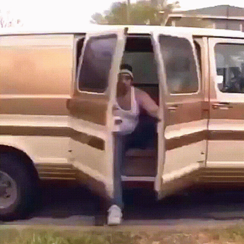 A man in a tank top and beanie leans out of his van, asking if you want to check it out because he has candies.