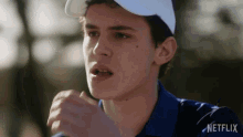 Ander Munoz, wearing a white cap and blue polo, looks exhausted and hot, wiping his forehead.
