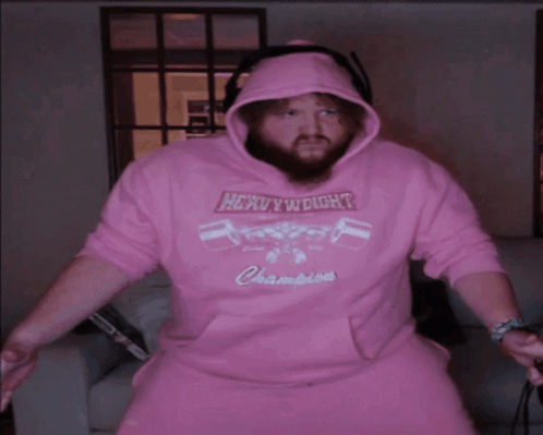Caseoh in a pink hoodie inflates a massive pink balloon under his shirt, creating a comical, oversized appearance.