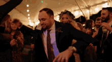 A couple joyfully dancing at a lively wedding reception under a tent with string lights.