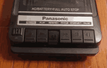 A finger presses buttons on a vintage Panasonic cassette player, demonstrating rewind, play, and fast forward functions.