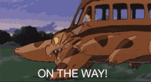 The iconic Cat Bus from My Neighbor Totoro is seen speeding across a landscape with the text 'ON THE WAY!'