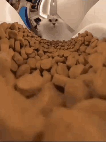 A white cat eats dry food from a bowl, filmed from a unique camera perspective inside the food.
