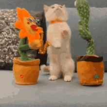 An adorable cat stands on its hind legs, dancing and interacting with a singing sunflower and a dancing cactus toy.