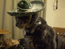 A cute tabby cat wearing a green sombrero and a collar, looking around with a curious expression.