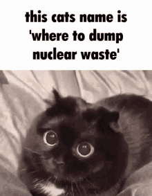 A black cat with wide, expressive eyes reacts to its unusual name: 'where to dump nuclear waste'.