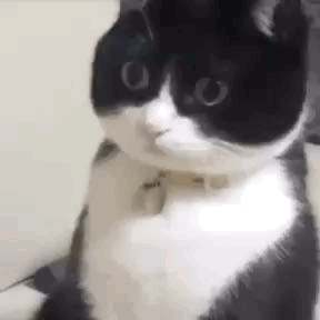 Black and white cat with wide, surprised eyes, wearing a collar and staring intently.