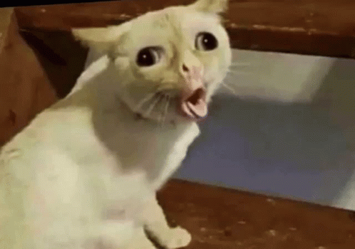 White cat on a wooden staircase with its mouth open, looking surprised or disgusted at the camera.