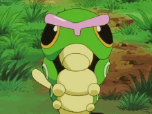 Caterpie, the green Pokémon caterpillar with a pink headpiece, stands in a grassy field.