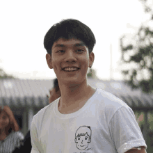 Ccopter smiling brightly, showing dimples, and wearing a white t-shirt with a cartoon drawing outdoors.