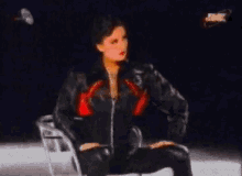 Ceca Raznatovic in a black jacket with red accents, striking a pose with bold red lipstick and dramatic eye makeup.