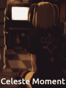 Animated character Celeste from Wizard101 watching an old television set in a dimly lit room.