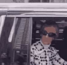 Celine in a car, wearing sunglasses and a patterned top, looking out the window with a building reflection.