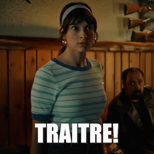 Woman in striped shirt reacts angrily to the word 'TRAITRE!' in a scene from the Quebecois show Cest Commeça Que Je Taime.