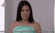 Grace Patcharasita, from Ch7drama's Chaosao Kaekhat, makes a disgusted face while wrapped in a green towel.