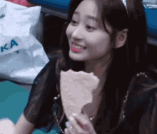 IZ*ONE's Kim Minju, also known as Chaetzukimbap Minju, eats a cracker and reacts with surprise to something.