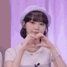 Kim Chaewon of LE SSERAFIM, wearing a beret, makes a cute heart gesture with her hands.