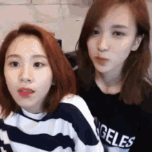 Chaeyoung and Mina from TWICE standing together, looking at the camera. Chaeyoung wears a striped shirt.