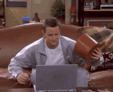 Chandler Bing from Friends sits on a couch with a laptop, putting a brown cylindrical object on his head.