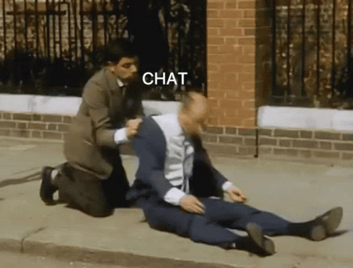 Mr. Bean performs CPR on a person labeled 'CHAT' in a humorous street scene, referencing the 'Darth Chat Revive' meme.