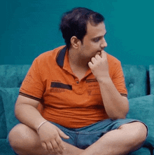 Rohit Sharma looks surprised while sitting on a teal couch, wearing an orange polo shirt.