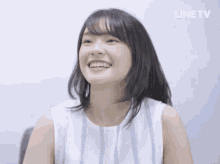 Thai idol Cherprang Areekul smiles brightly, wearing a striped top with the LINE TV logo visible.