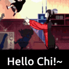 Anya and Yor from Spy X Family in a charming pixel art animation, dancing and interacting with a 'Hello Chi!' caption.
