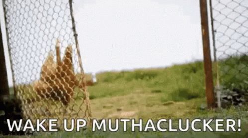 A chicken hangs upside down from a fence, shaking a cup, with the text 'WAKE UP MUTHACLUCKER!' as a humorous alarm.