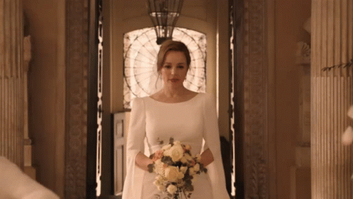 Christine Palmer and Clea's wedding scene, with Christine as the bride holding a floral bouquet.