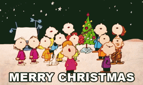 Charlie Brown and the Peanuts gang sing "Merry Christmas" around a festive tree in a snowy, animated scene.