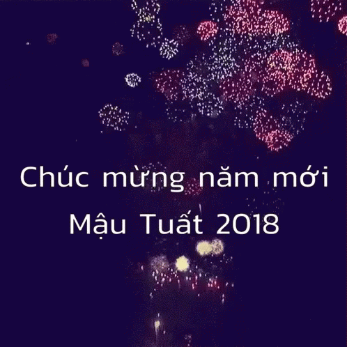 A vibrant fireworks display celebrating the Vietnamese New Year, Mậu Tuất 2018, with on-screen text.