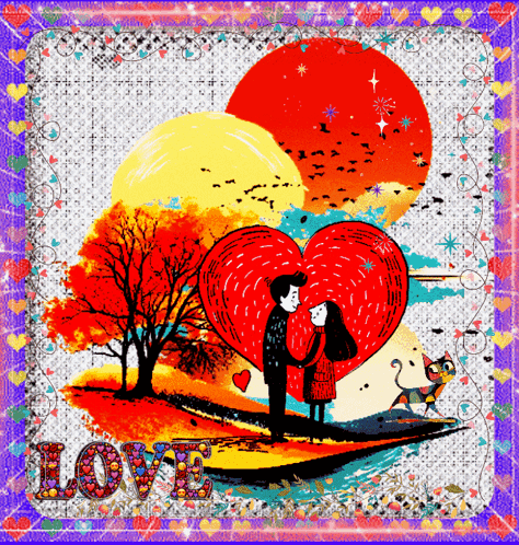 A vibrant, romantic illustration featuring a loving couple, a large heart, and the word 'LOVE'.