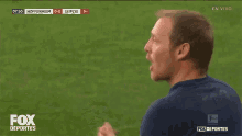A coach for Hoffenheim claps on the sidelines during a Bundesliga soccer match against Leipzig, broadcast on Fox Deportes.