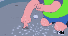 Clarence creates a sparkling disco effect on the ground using his finger and a small purple ball.