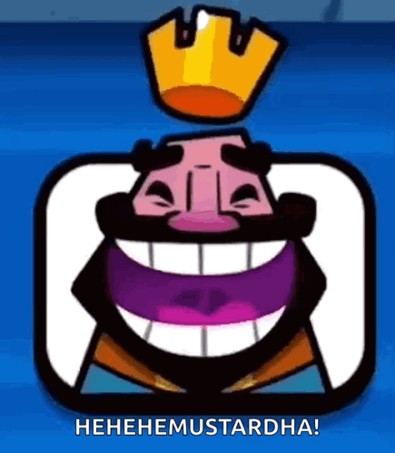The iconic Clash Royale King laughs heartily, exclaiming 'HEHEHEMUSTARDHA!' in this popular meme.