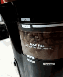 Close-up of a coffee grinder showing the 'MAX FILL' line and coffee beans inside.