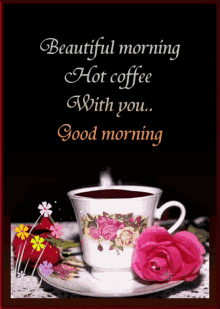 A warm good morning greeting featuring a cup of hot coffee, steam, and beautiful roses.