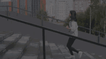 A woman runs up stairs, promoting Colefna's call for professional regulation in physical education.