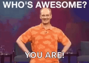 Colin Mochrie from Whose Line Is It Anyway points at the viewer, asking 'Who's awesome?' and declaring 'You are!'