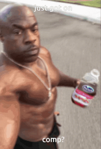 A muscular man holding a bottle asks "just got on comp?", likely referring to competitive gaming.