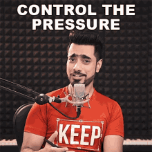 Unmesh Dinda speaks into a microphone about controlling pressure, wearing a red 'KEEP' shirt.