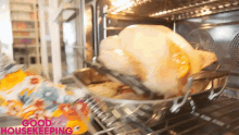 A person wearing a floral oven mitt places a golden-brown turkey in a roasting pan into a hot oven.