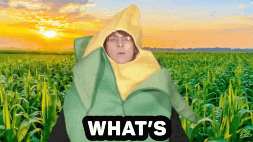 A person in a corn on the cob costume stands in a corn field, saying 'Up Shuckers'.