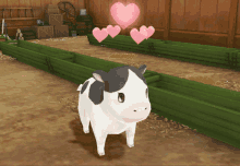 An adorable black and white calf stands in a barn with pink hearts floating above its head.