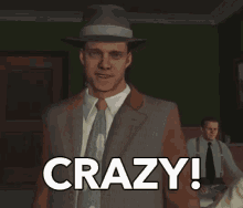 A man in a fedora and suit exclaims 'Crazy!' in a game cutscene, with the word superimposed.