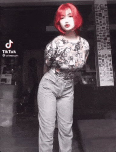 Crimason performs a lively TikTok dance to Shinee's 'Ring Ding Dong', showcasing her moves with red hair.
