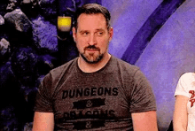 Travis Willingham from Critical Role closes and opens his eyes, wearing a Dungeons & Dragons shirt.